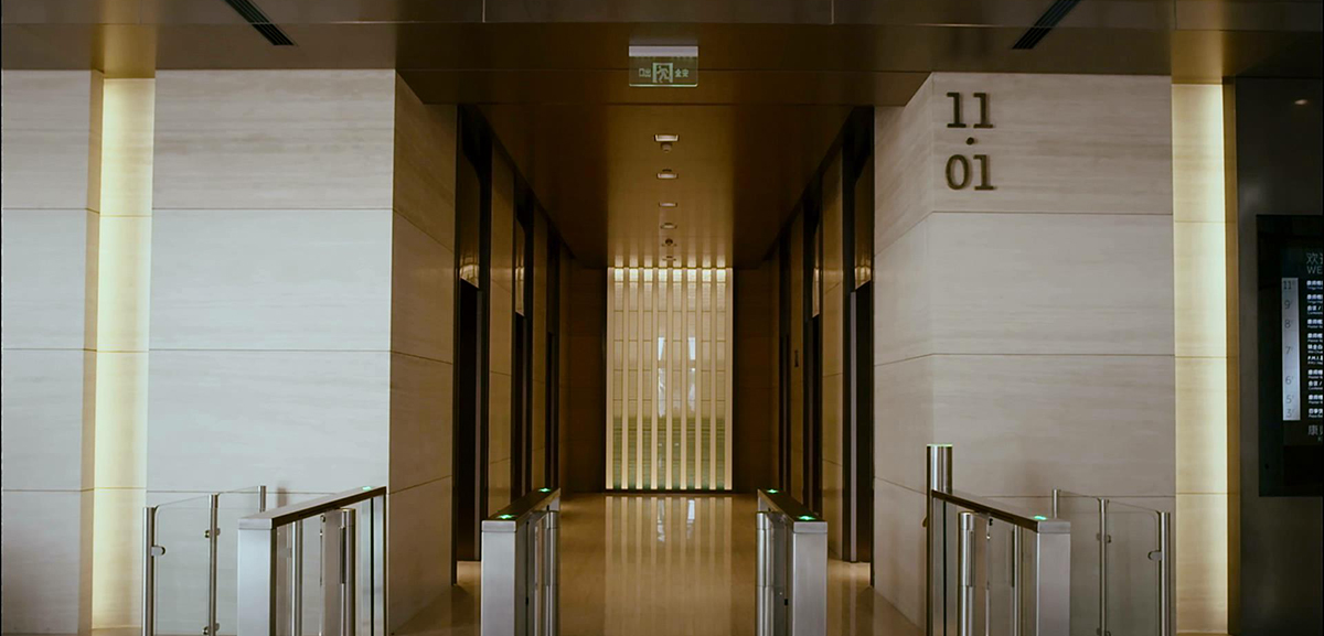 大堂配置快速通道闸机、OTIS高轿箱精装垂直电梯,出入办公楼安全迅捷可靠